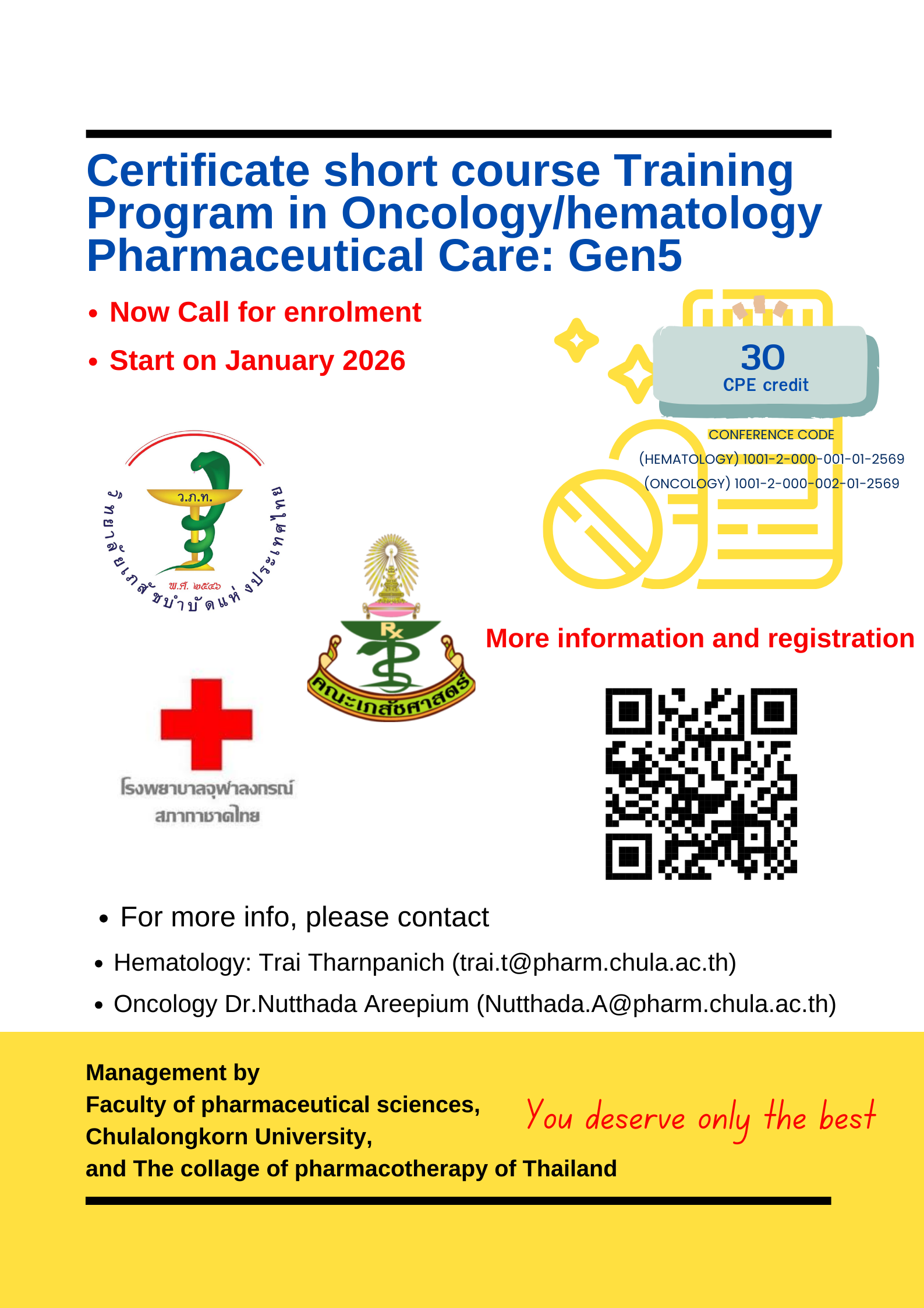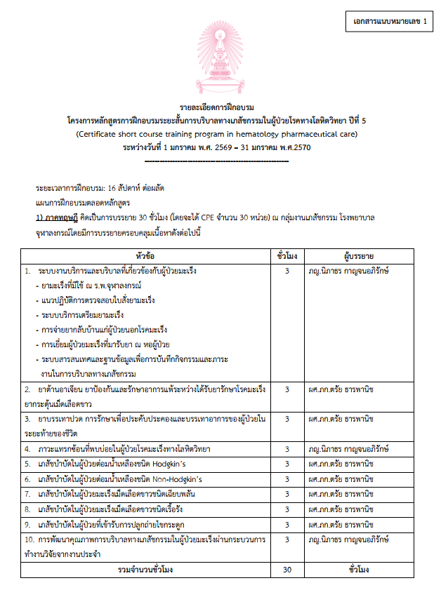 ด้วยความตระหนักในความสำคัญของบทบาทเภสัชกรในการดูแลผู้ป่วยมะเร็งร่วมกับสหสาขาวิชาชีพ คณะเภสัชศาสตร์ จุฬาลงกรณ์มหาวิทยาลัย จึงเล็งเห็นความสำคัญของเภสัชกรที่จะต้องมีความรู้ ความเข้าใจ และมีความชำนาญในการดูแลผู้ป่วยมะเร็ง จึงได้ร่วมมือกับหน่วยผสมยาเคมีบำบัด กลุ่มงานเภสัชกรรม โรงพยาบาลจุฬาลงกรณ์ และสาขาวิชาโรคโลหิตวิทยา ภาควิชาอายุรศาสตร์ คณะแพทยศาสตร์ จุฬาลงกรณ์มหาวิทยาลัย ได้จัดทำหลักสูตรประกาศนียบัตรวิชาชีพเภสัชกรรม (สาขาการบริบาลทางเภสัชกรรมในผู้ป่วยมะเร็งทางโลหิตวิทยา) Certificate in Pharmacy (Hematology Pharmaceutical Care) หลักสูตรภาคปฏิบัติ 16 สัปดาห์ โดยมีเนื้อหาทางทฤษฎีสอดแทรกตลอดระยะของการฝึกปฏิบัติงาน กำหนดให้เภสัชกรฝึกปฏิบัติงาน ณ หน่วยผสมยาเคมีบำบัด และหน่วยให้ยาเคมีบำบัดผู้ป่วยนอก อาคารว่องวานิช ชั้น 4 รวมถึงการฝึกปฏิบัติงาน ณ หอผู้ป่วยเคมีบำบัด 20A (หลิ่มซีลั่นบน) อาคารภูมิสิริ มังคลานุสรณ์ โรงพยาบาลจุฬาลงกรณ์ เภสัชกรที่เข้ารับการฝึกจะได้มีโอกาสปฏิบัติงานร่วมกับสหสาขาวิชาชีพที่มีความชำนาญในการบริบาลเภสัชกรรมในผู้ป่วยมะเร็งทางโลหิตวิทยา โดยหลักสูตรนี้มีนโยบายและยุทธศาสตร์สอดคล้อง กับความต้องการของกระทรวงสาธารณสุข