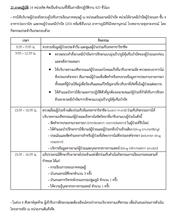 2) ภาคปฏิบัติ การให้บริบาลผู้ป่วยจริงควบคู่ไปกับการเรียนภาคทฤษฎี ณ หน่วยเตรียมยาเคมีบำบัด หน่วยให้ยาเคมีบำบัดผู้ป่วยนอก ชั้น 4 อาคารว่องวานิช และหอผู้ป่วยเคมีบำบัด (20A หลิ่มซีลั่นบน) อาคารภูมิสิริมังคลานุสรณ์ โรงพยาบาลจุฬาลงกรณ์