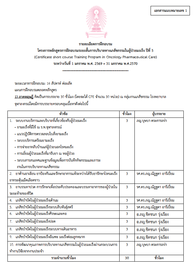 โครงการหลักสูตรการฝึกอบรมระยะสั้นการบริบาลทางเภสัชกรรม ในผู้ป่วยมะเร็ง ปีที่ 5