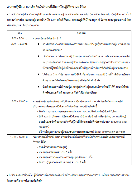 2) ภาคปฏิบัติ การให้บริบาลผู้ป่วยจริงควบคู่ไปกับการเรียนภาคทฤษฎี ณ หน่วยเตรียมยาเคมีบำบัด หน่วยให้ยาเคมีบำบัดผู้ป่วยนอก ชั้น 4 อาคารว่องวานิช และหอผู้ป่วยเคมีบำบัด (20A หลิ่มซีลั่นบน) อาคารภูมิสิริมังคลานุสรณ์ โรงพยาบาลจุฬาลงกรณ์