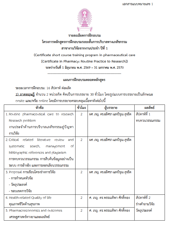โครงการหลักสูตรการฝึกอบรมระยะสั้นการบริบาลทางเภสัชกรรม สาขางานวิจัยจากงานประจำ ปีที่ 1