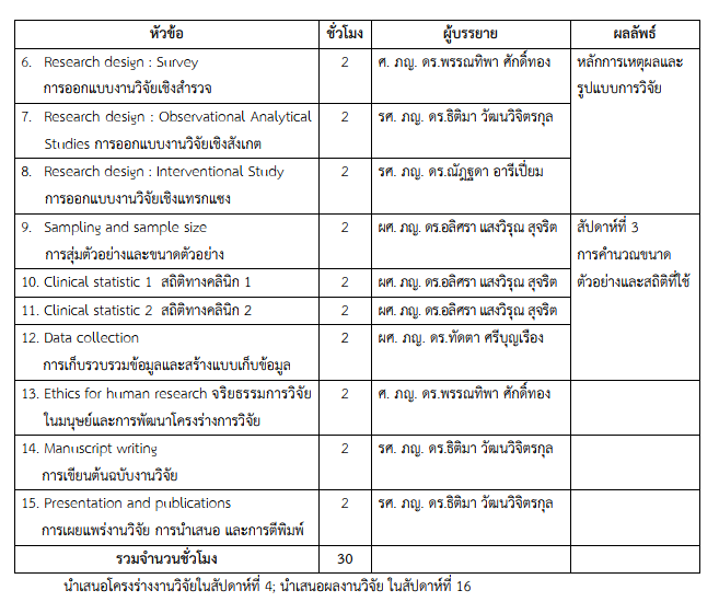 2. เมื่อสำเร็จหลักสูตรนี้ ผู้เรียนสามารถดำเนินงานวิจัยและสามารถนำงานวิจัยไปใช้พัฒนางานด้านการบริบาลทางเภสัชกรรมได้อย่างมีประสิทธิภาพและเป็นรูปธรรม เพื่อประโยชน์ต่อผู้ป่วยต่อไปอ