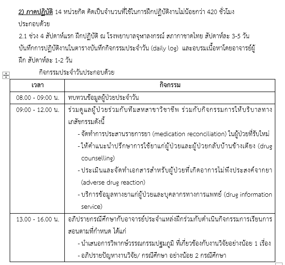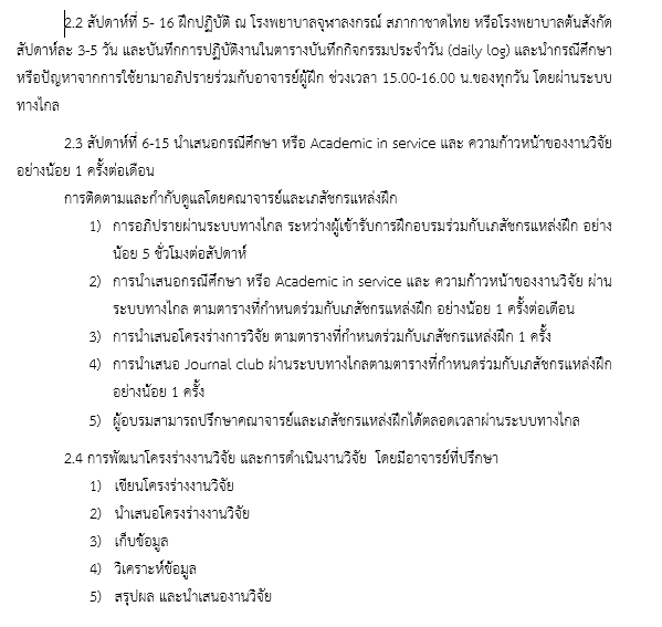 2. ภาคปฏิบัติ   ณ โรงพยาบาลจุฬาลงกรณ์ สภากาชาดไทย สัปดาห์ละ 3-5 วัน บันทึกการปฏิบัติงานในตารางบันทึกกิจกรรมประจำวัน (daily log)  และอบรมเนื้อหาโดยอาจารย์ผู้ฝึก