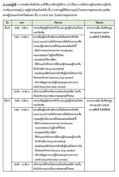1. ให้บริบาลเภสัชกรรมผู้ป่วยโรคหัวใจระบบและหลอดเลือดได้อย่างเหมาะสมรวมทั้งสามารถประเมินภาวะสุขภาพของผู้ป่วยเบื้องต้นได้ โดยให้ความรู้เกี่ยวกับการใช้ยามาตรฐานสำหรับผู้ป่วยโรคหัวใจระบบและหลอดเลือด รวมถึงการปฏิบัติตัวระหว่างที่ใช้ยาดังกล่าว