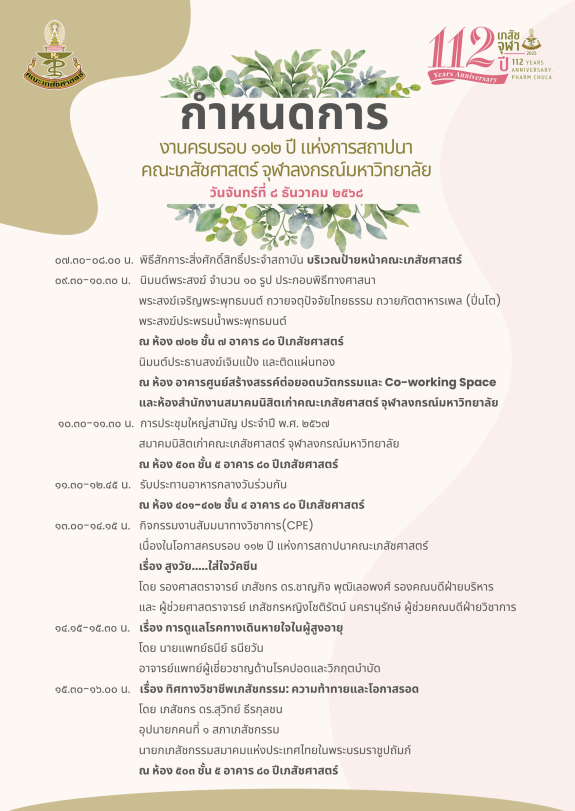 ใด้วยวาระที่คณะเภสัชศาสตร์ จุฬาลงกรณ์มหาวิทยาลัย ฉลองครบรอบ 112 ปี ในวันที่ 8 ธันวาคม พ.ศ. 2568 เพื่อเป็นการเฉลิมฉลองวาระดังกล่าว คณะเภสัชศาสตร์จึงจัดให้มีการประชุมวิชาการศึกษาต่อเนื่อง ทางคณะเภสัชศาสตร์ จุฬาลงกรณ์มหาวิทยาลัย และได้เรียนเชิญศิษย์เก่า คณาจารย์ผู้เกษียณและคณาจารย์ ปัจจุบัน นิสิต และผู้มีคุณูปการต่อคณะเภสัชศาสตร์มาร่วมงานสำคัญในครั้งนี้