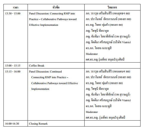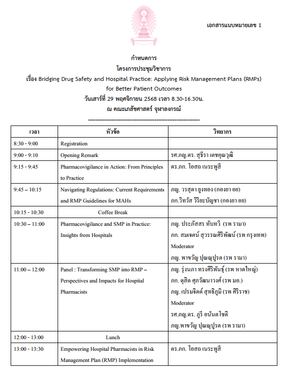นอกจากนี้ การพัฒนาองค์ความรู้ด้าน RMP ในหมู่เภสัชกรโรงพยาบาลยังสอดคล้องกับทิศทางการพัฒนาระบบสุขภาพที่มุ่งเน้น patient safety และ evidence-based practice ซึ่งไม่เพียงแต่ช่วยลดความเสี่ยงจากการใช้ยา แต่ยังสนับสนุนการใช้ทรัพยากรอย่างคุ้มค่าและยั่งยืน อีกทั้งยังช่วยเสริมสร้างความมั่นใจให้แก่ผู้ป่วย ครอบครัว และสังคมต่อระบบบริการสุขภาพ โดยการทำให้เภสัชกรสามารถทำหน้าที่เป็น “safety manager” ด้านยาได้อย่างเต็มศักยภาพ เป็นการเพิ่มประสิทธิภาพบทบาทของเภสัชกรในโรงพยาบาลยุคใหม่ ดังนั้น การจัดประชุมวิชาการในหัวข้อ “Bridging Drug Safety and Hospital Practice: Applying Risk Management Plans (RMPs) for Better Patient Outcomes” จึงมีวัตถุประสงค์เพื่อสร้างความรู้ความเข้าใจและเสริมศักยภาพเภสัชกรโรงพยาบาลในการนำข้อมูล Risk Management Plan (RMP) ไปประยุกต์ใช้ในงานเภสัชกรรมโรงพยาบาล