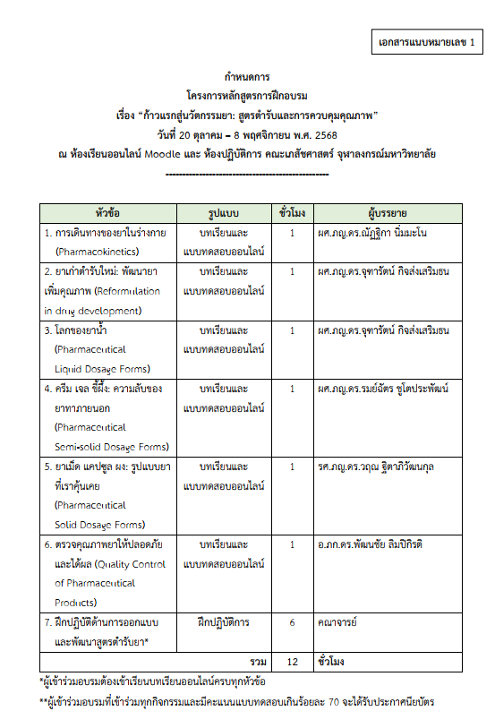 2) ฝึกปฏิบัติการ จำนวน 6 ชั่วโมง วันเสาร์ ที่ 8 พ.ย. 2568 ณ คณะเภสัชศาสตร์ จุฬาลงกรณ์มหาวิทยาลัย