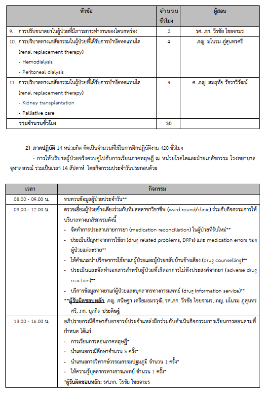2. ภาคปฏิบัติ การให้บริบาลผู้ป่วยจริงควบคู่ไปกับการเรียนภาคทฤษฎี ณ หน่วยโรคไตและฝ่ายเภสัชกรรม อาคารภูมิสิริมังคลานุสรณ์ ชั้น 10 โซน C โรงพยาบาลจุฬาลงกรณ์ สภากาชาดไทย