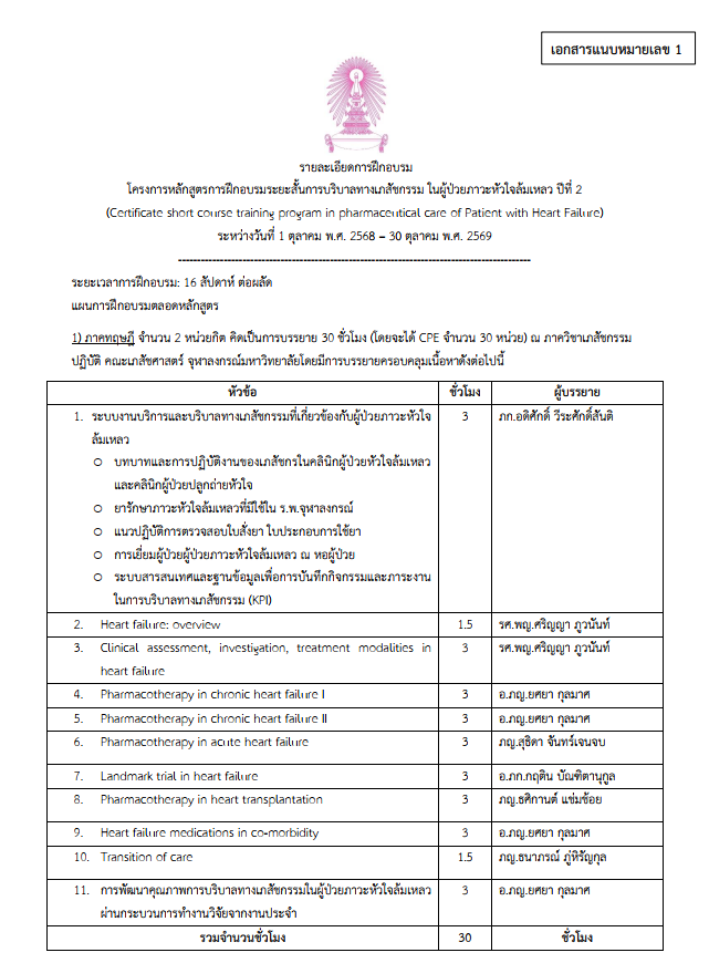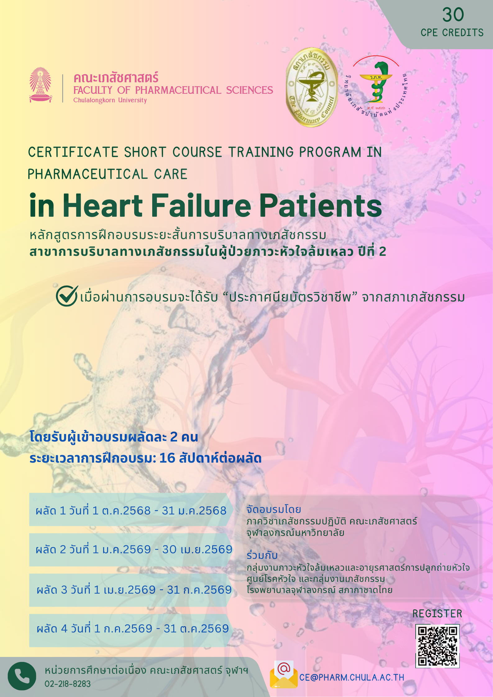 ด้วยความตระหนักในความสำคัญของบทบาทเภสัชกรในการดูแลผู้ป่วยภาวะหัวใจล้มเหลวร่วมกับสหสาขาวิชาชีพ ภาควิชาเภสัชกรรมปฏิบัติ คณะเภสัชศาสตร์ จุฬาลงกรณ์มหาวิทยาลัย และวิทยาลัยเภสัชบำบัดแห่งประเทศไทย สภาเภสัชกรรม จึงเล็งเห็นความสำคัญของเภสัชกรที่ต้องมีความรู้ ทักษะ และชำนาญในการดูแลผู้ป่วยภาวะหัวใจล้มเหลว จึงได้ร่วมมือกับกลุ่มงานภาวะหัวใจล้มเหลวและอายุรศาสตร์การปลูกถ่ายหัวใจ ศูนย์โรคหัวใจ โรงพยาบาลจุฬาลงกรณ์ สภากาชาดไทย สาขาวิชาอายุรศาสตร์หัวใจและหลอดเลือด ภาควิชาอายุรศาสตร์ คณะแพทยศาสตร์ จุฬาลงกรณ์มหาวิทยาลัย และกลุ่มงานเภสัชกรรม โรงพยาบาลจุฬาลงกรณ์ สภากาชาดไทย จัดทำหลักสูตรประกาศนียบัตรวิชาชีพเภสัชกรรม (สาขาการบริบาลทางเภสัชกรรมในผู้ป่วยภาวะหัวใจล้มเหลว) Certificate in Pharmacy (Pharmaceutical Care of Patient with Heart Failure) หลักสูตรภาคปฏิบัติ 16 สัปดาห์ โดยมีเนื้อหาทางทฤษฎีสอดแทรกตลอดระยะของการฝึกปฏิบัติงาน กำหนดให้เภสัชกรฝึกปฏิบัติงานทั้งผู้ป่วยในและผู้ป่วยนอก ณ คลินิกผู้ป่วยหัวใจล้มเหลว คลินิกผู้ป่วยปลูกถ่ายหัวใจ โรงพยาบาลจุฬาลงกรณ์ รวมถึงการฝึกปฏิบัติงาน ณ หอผู้ป่วยในที่มีผู้ป่วยภาวะหัวใจล้มเหลวเข้ารับการรักษา เภสัชกรที่เข้ารับการฝึกจะได้มีโอกาสปฏิบัติงานร่วมกับสหสาขาวิชาชีพที่มีความชำนาญในการบริบาลผู้ป่วยภาวะหัวใจล้มเหลว