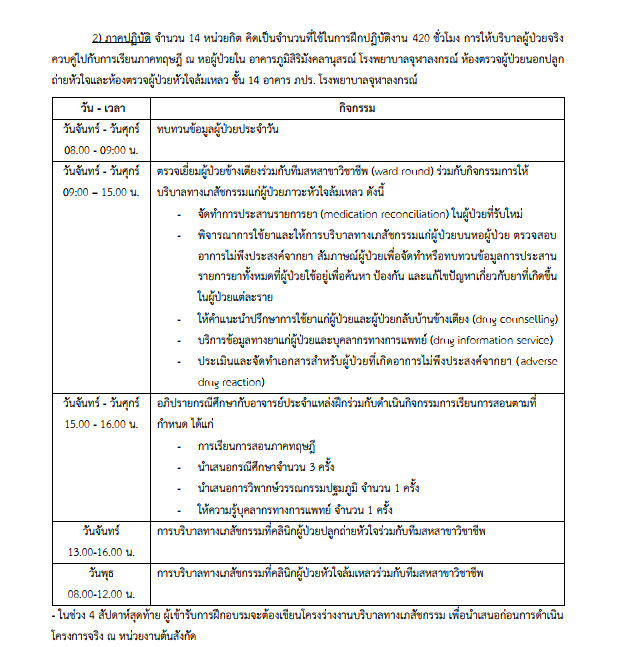 2) ภาคปฏิบัติ ณ หอผู้ป่วยใน อาคารภูมิสิริมังคลานุสรณ์ โรงพยาบาลจุฬาลงกรณ์ ห้องตรวจผู้ป่วยนอกปลูกถ่ายหัวใจและห้องตรวจผู้ป่วยหัวใจล้มเหลว ชั้น 14 อาคาร ภปร. โรงพยาบาลจุฬาลงกรณ์