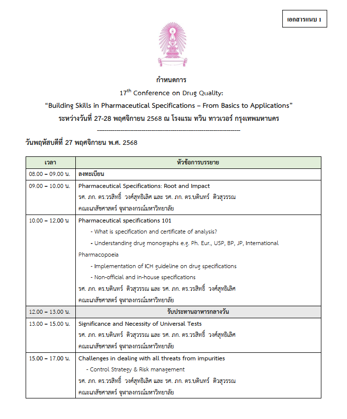 ตั้งแต่ปี 2557 คณะเภสัชศาสตร์ จุฬาลงกรณ์มหาวิทยาลัย มีการจัดประชุมวิชาการด้านคุณภาพมาทั้งหมดสิบหกครั้ง ทั้งในรูปแบบ on-site และ online ซึ่งได้รับผลการตอบรับจากผู้เข้าร่วมอบรมอย่างดีเยี่ยม จึงเป็นแรงผลักดันให้เกิดการจัดประชุมวิชาการขึ้นเป็นครั้งที่ 17 ด้วยเล็งเห็นถึงความต้องการจากเภสัชกรผู้มีส่วนเกี่ยวข้องในกระบวนคัดเลือกเภสัชภัณฑ์เข้าสู่โรงพยาบาล โดยมุ่งหวังว่าการประชุมวิชาการในครั้งนี้จะเป็นส่วนหนึ่งในการพัฒนาคุณภาพเภสัชภัณฑ์ในระบบยาของประเทศ
