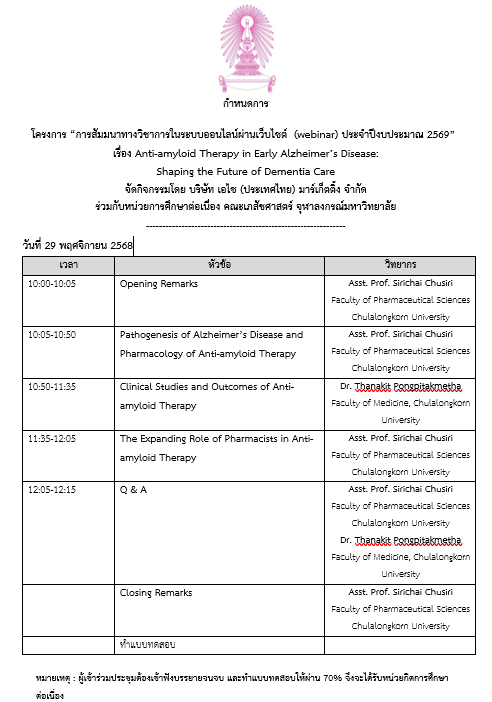 1. เพื่อให้ความรู้แก่เภสัชกรและผู้ที่สนใจในเรื่องพยาธิวิทยาของการเกิดโรคอัลไซเมอร์ การรักษา โดยมุ่งเน้นในเรื่อง Amyloid beta, เภสัชวิยาของยากลุ่ม Anti-amyloid และบทบาทหน้าที่ของเภสัชกรในการดูแลผู้ป่วยที่ได้รับยา Anti-amyloid
