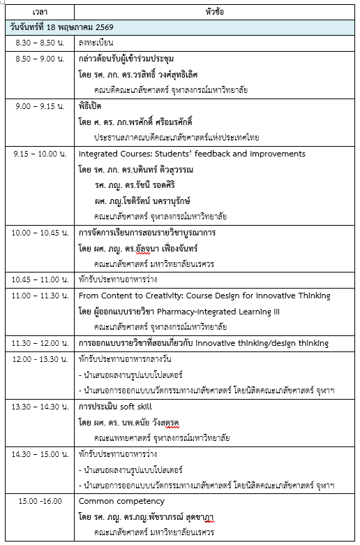 การจัดประชุมวิชาการเภสัชศาสตรศึกษาแห่งชาติ ประจำปี 2569 ภายใต้หัวข้อ “Transforming Pharmacy Education: Cultivating Leadership and Innovative Thinking” จัดขึ้นเพื่อเป็นเวทีในการแลกเปลี่ยนองค์ความรู้ ประสบการณ์ และแนวทางการพัฒนาการศึกษาเภสัชศาสตร์ นอกจากนี้ การประชุมยังเป็นพื้นที่ในการนำเสนอแนวปฏิบัติที่ดี (Best Practices) และนวัตกรรมทางการศึกษา ที่ช่วยเสริมสร้างทักษะการคิดเชิงสร้างสรรค์ การแก้ปัญหาอย่างมีระบบ และการปรับตัวเชิงรุกให้กับนิสิตเภสัชศาสตร์ ซึ่งจะนำไปสู่การยกระดับมาตรฐานวิชาชีพเภสัชกรรมให้สอดคล้องกับการเปลี่ยนแปลงของสังคมโลก